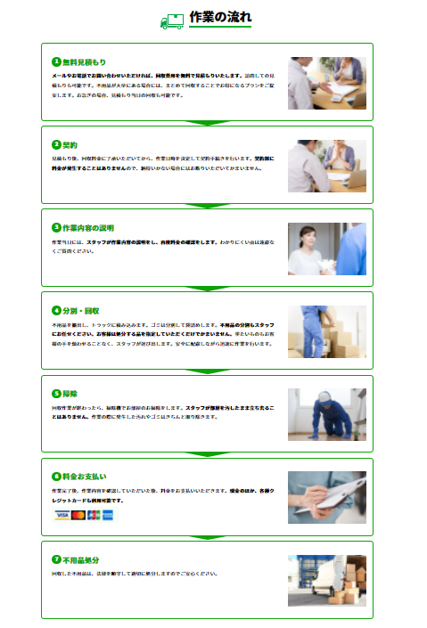 エコスリーでは不用品を搬出したらそのまま終了ではありません。作業の際に発生したゴミは、きちんと掃除してくれます。掃除が完了したら料金の支払いです。作業内容を確認した後、現金またはクレジットカードで支払いを行います。以上で不用品回収作業は終了です。